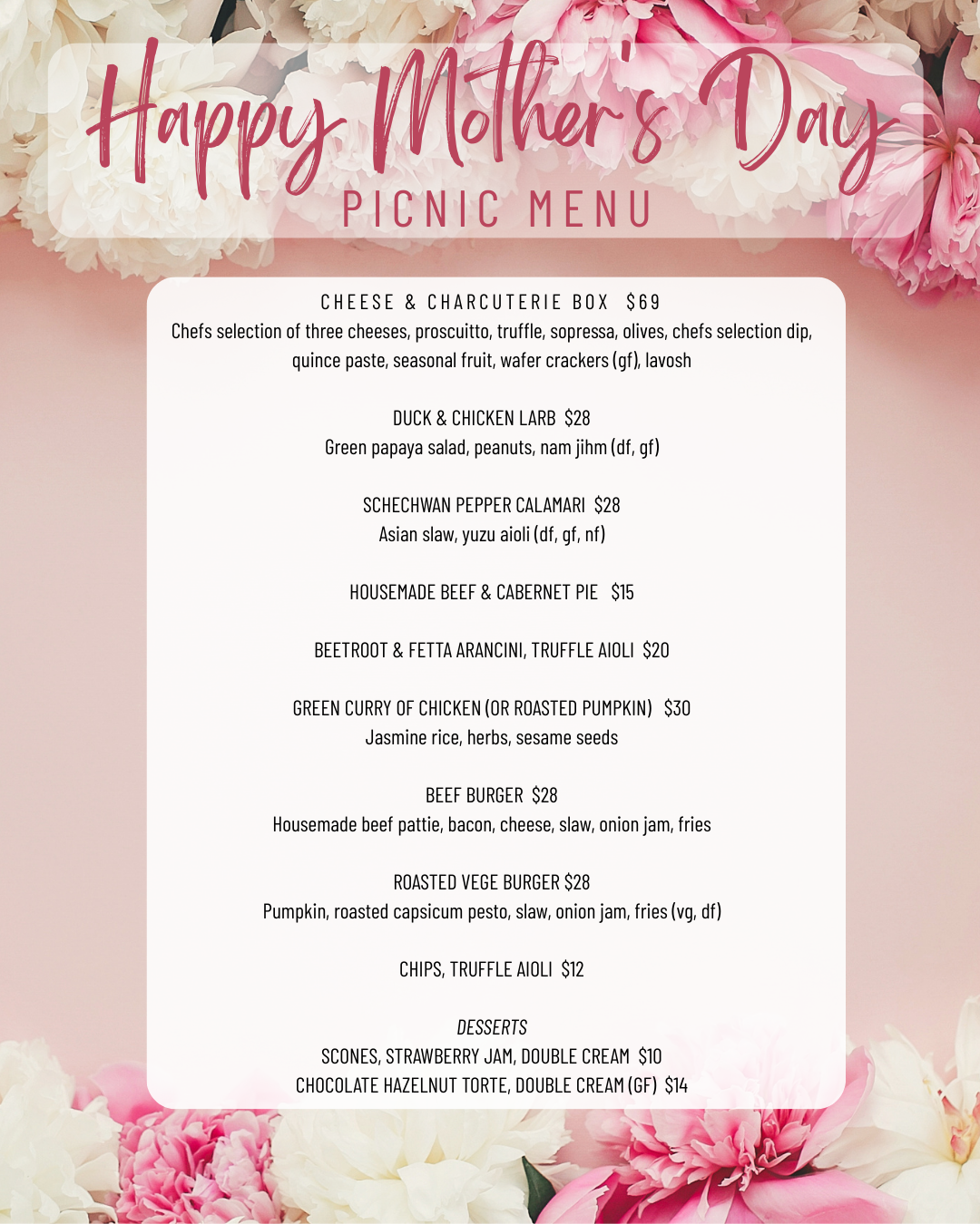order picnic food from our qr code on the day. byo blankets/chairs, etc.